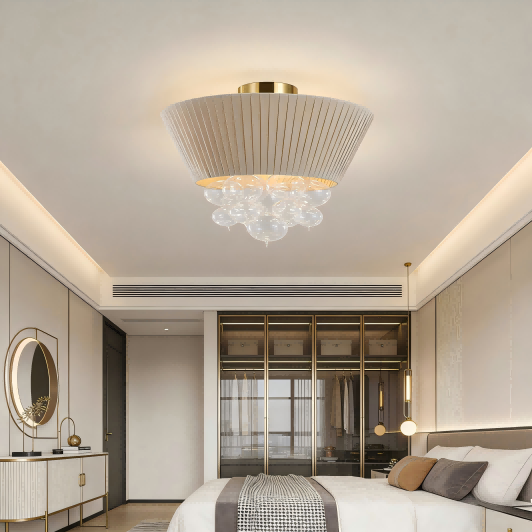 Během své dlouhodobé služby na evropském a americkém trhu společnost Strong Lighting vždy věnovala velkou pozornost estetickým potřebám a scénářům použití koncových uživatelů. Látkové stínidlo této stropní lampy je vyrobeno ručně lisovanými texturními technikami, které vytvářejí přirozenou a trojrozměrnou skládanou texturu. Světlo, které vyzařuje, je měkké a rovnoměrně rozložené a vytváří teplé a pohodlné světelné prostředí. Skleněné bubliny visící dole jsou ručně foukané, každá má trochu jiný tvar. Když se rozsvítí, vypadají jako zavěšené světelné korálky, které představují dynamický a okouzlující efekt světla a stínu. Ať už je použit v severském minimalistickém rezidenčním prostoru nebo komerčním místě s lehkým luxusním stylem, může výrazně zvýšit kvalitu prostoru.