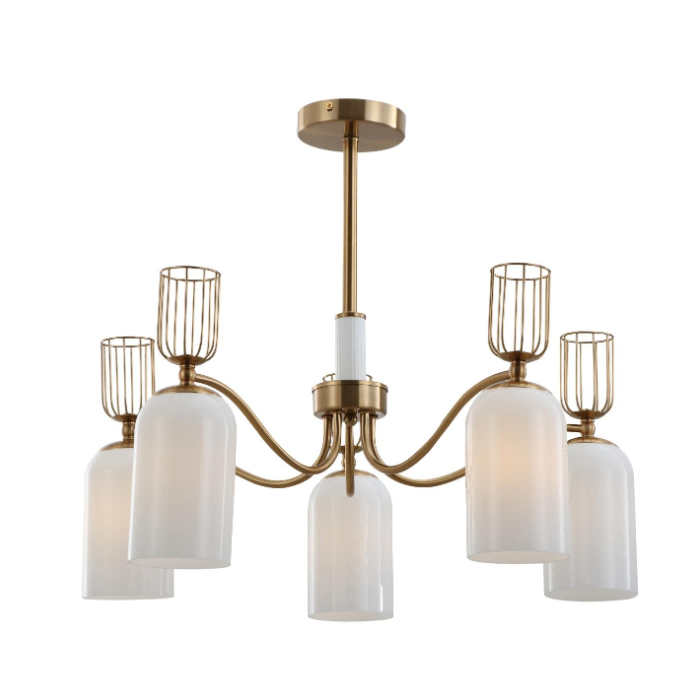 Dekorativní kovové límce: Složité kovové práce z retro 5-světlí mléka bílý skleněný zlatý zlatý lustr nad každým odstínem zvyšuje přitažlivost vintage.
